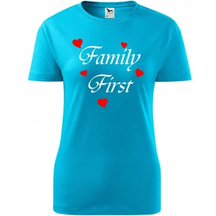 Damska Koszulka na Dzień Mamy Family First na Prezent dla Mamy Urodziny turkusowy L ❤️ O koszulce Damskiej 100 % ekologicznej bawełny wzmocnienie na ramiona...
