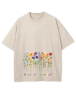 Damska koszulka oversize efekt sprania Kolorowe Kwiaty Wiosna Beżowa S