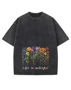 Damska koszulka oversize efekt sprania Kolorowe Kwiaty Wiosna Czarna M
