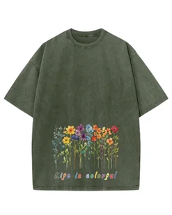Damska koszulka oversize efekt sprania Kolorowe Kwiaty Wiosna Khaki 3XL