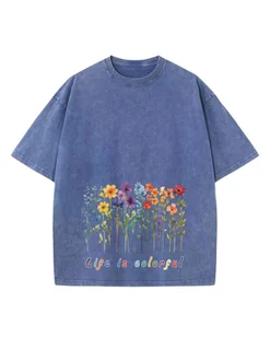 Damska koszulka oversize efekt sprania Kolorowe Kwiaty Wiosna Niebieska M