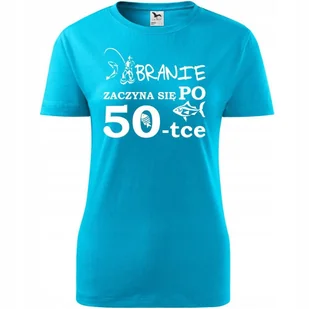 Damska Koszulka z Nadrukiem Branie zaczyna się po 50, ryba Prezent Urodziny turkusowy XS ❤️ O koszulce Damskiej 100 % ekologicznej bawełny wzmocnienie na ra...