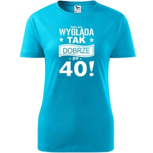 Damska Koszulka z Nadrukiem Mało kto wygląda tak dobrze po 40 na Prezent turkusowy L ❤️ O koszulce Damskiej 100 % ekologicznej bawełny wzmocnienie na ramion...