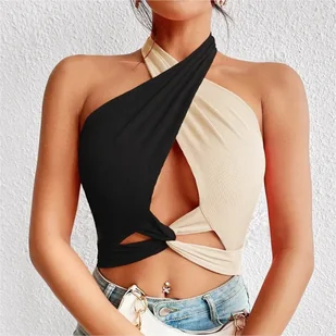 Dwukolorowy damski top wiązany na szyi - Czarno-beżowy
