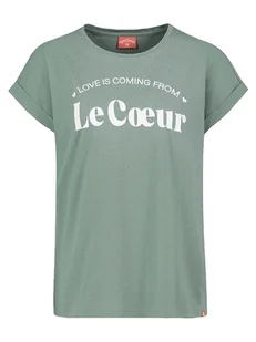 Koszulka w kolorze turkusowym - z dodatkiem bawełny - dekolt: okrągły - detale: nakładane rękawki - krój: luźny - nadruk: w formie napisu - look: jednokolorowy