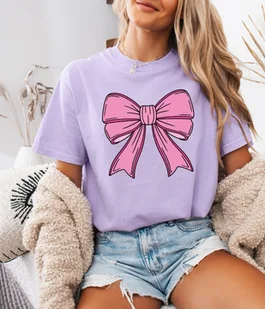 Fiołkowa koszulka damska z nadrukiem różowej kokardy Jeżeli chodzi o rozmiary koszulek. To tabela jest poniżej. Najlepiej porównaj sobie wymiary z koszulkami które posiadasz. I dobierz odpowiedni rozmiar zależnie od tego jaki efekt chcesz uzyskać , koszulki bardziej dopasowanej czy dużego luźnego OVERSIZE . Materiał: bawełna - bardzo miła w dotyku.