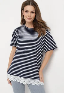 Granatowy T-shirt Bawełniany w Paski z Ozdobną Koronką Priscaia