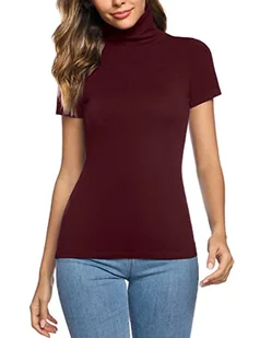 Irevial Damski T-shirt elegancki Basic Slim Fit Top dla kobiet z krótkim rękawem ze stójką, czerwony (Weinrot), S