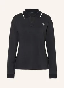 Prosty krój. Otwarty kołnierz polo. Długie rękawy. Zachodzące ramiona. Boczne rozcięcia. Przedłużony tył. Haft z marką na klatce piersiowej. Kontrastowe paski na krawędziach. Dżersej