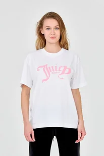 Biały t-shirt damski Amanza z różowym logo. Pranie do 30C, prasować w temp. do 110C, nie suszyć w suszarce, nie wybielać, nie wykręcać. ROZMIAR I DOPASOWANIE: Wymiary modelki: