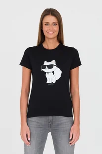 Czarny t-shirt damski marki Karl Lagerfeld. Wymiary modelki: wzrost 176 cm, biust 85 cm, talia 65 cm, biodra 92 cm. Modelka ma na sobie produkt w rozmiarze S. Czarny t-shirt damski marki Karl Lagerfeld.