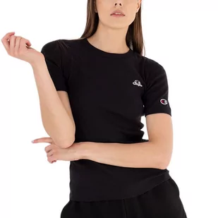 Koszulka damska Champion Crewneck 115932-KK001 – czarna Klasyczna koszulka damska Champion Crewneck. Model klasycznej koszulki to obowiązkowy element garderoby każdej dziewczyny. Wykonany został z wysokiej jakości materiału, który gwarantuje komfort w codziennym użytkowaniu. Posiada krótki rękaw i zaokrąglony dekolt, który zapewnia dobre dopasowanie. Całość zdobi logo Champion umieszczone na piersi oraz na rękawku.