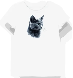 Koszulka damska biała z motywem błękitnoszarego kota w blasku L