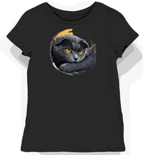 Koszulka damska czarna z motywem szarego szkockiego kota w blasku L - Koszulka damska idealna na prezent! KozakNadruki – Polska marka i autorskie projekty! S...