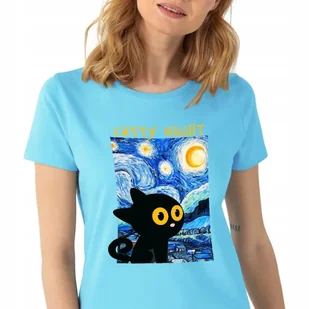 KOSZULKA DAMSKA TURKUS NA PREZENT DLA MIŁOŚNIKA KOTÓW CATTY NIGHT WZORY - S