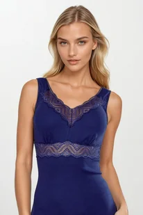 Koszulka na szerokich ramiączkach Ronia z koronkowym wykończeniem to elegancki i niezwykle komfortowy model, który doskonale sprawdza się zarówno jako element codziennej garderoby, jak i delikatna bielizna nocna. Dopasowany fason subtelnie podkreśla sylwetkę, a starannie dobrane detale nadają całości kobiecego charakteru. Koszulka została wykonana z miękkiej dzianiny zawierającej 95% bawełny, dzięki czemu materiał jest przyjemny dla skóry, przewiewny i wygodny w codziennym noszeniu. Dodatek poliamidu sprawia, że tkanina jest bardziej elastyczna i lepiej dopasowuje się do sylwetki. Model wyróżnia się dekoltem w kształcie litery V zarówno z przodu, jak i na plecach, który subtelnie podkreśla linię szyi oraz ramion.