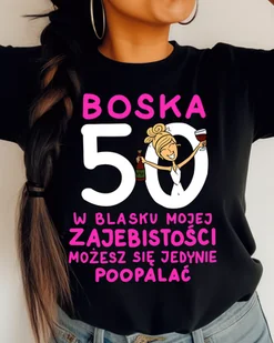 Czarna damska koszulka na 50 urodziny boska 50 T-shirt damski o modnym kroju. Rękawki proste. Koszulka z wyjątkową grafiką . Bluzeczka wykonana z bawełny.