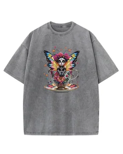 Koszulka oversize efekt sprania Słodka Wróżka Kwiaty szary M
