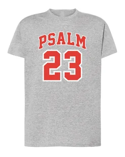M, L, XL Gramatura : 150 g/m² (biała 145 g/m²) Koszulka bezszwowa Koszulka Psalm 23 Pan jest moim Pasterzem Koszulka „Psalm 23 Pan jest moim Pasterzem” to połączenie wiary i stylu w sportowym, minimalistycznym wydaniu. Nadruk nawiązuje do jednego z najbardziej rozpoznawalnych psalmów, który symbolizuje zaufanie, ochronę i spokój płynący z wiary. Duży, kontrastowy napis „PSALM 23” w stylu college nadaje wzorowi energii i nowoczesnego charakteru, jednocześnie zachowując duchowe przesłanie. Projekt inspirowany jest typografią amerykańskich drużyn sportowych, co czyni go nie tylko wyrazem wiary, ale też modnym elementem garderoby.