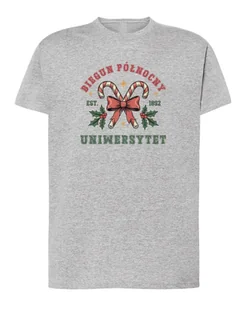 M, L, XL Gramatura : 150 g/m² (biała 145 g/m²) Koszulka bezszwowa Koszulka Świąteczna Uniwersytet Świętego Mikołaja Koszulka „Świąteczna Uniwersytet Świętego Mikołaja” to wyjątkowy projekt, który łączy styl college’owy z magiczną atmosferą świąt. Na nadruku widnieją dwa skrzyżowane cukrowe laski przewiązane czerwoną kokardą, otoczone gałązkami ostrokrzewu i napisem „Biegun Północny Uniwersytet – Est. 1892”. Grafika utrzymana jest w klasycznych bożonarodzeniowych barwach: czerwieni, zieleni i bieli, dzięki czemu idealnie oddaje ducha zimowych świąt.