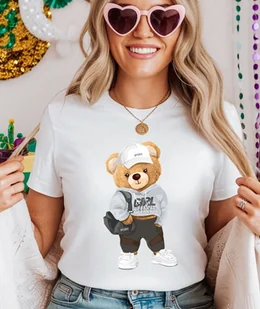 DAMSKA Koszulka z misiem T-shirt damski o modnym kroju. Rękawki proste. Koszulka z wyjątkową grafiką . Bluzeczka wykonana z bawełny. Koszulka z nadrukiem -materiał : bawełna.