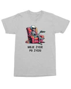 M, L, XL Gramatura : 150 g/m² (biała 145 g/m²) Koszulka bezszwowa Koszulka z nadrukiem Życie po życiu Koszulka moje życie po życiu to idealna propozycja dla fanów czarnego humoru i luźnego stylu. Nadruk przedstawia barwnie stylizowanego szkieleta w okularach, z pilotem w ręku, odpoczywającego w fotelu – idealne zobrazowanie relaksu po życiu. Żywe kolory i dynamiczna grafika nadają unikalnego charakteru, a zabawne hasło sprawia, że t-shirt przyciąga uwagę. Świetna opcja dla osób z dystansem do rzeczywistości oraz jako prezent dla miłośników nietypowych wzorów.