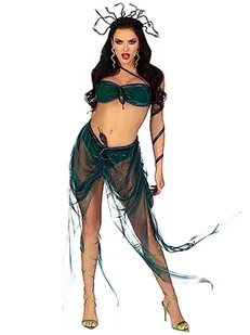 Leg Avenue 4 PC Medusa, includes iridescent asymmetrical bra top with stuffed snake accent, skirt with built in panty and snake waist, arm wrap, and wired glitter snake headband Green