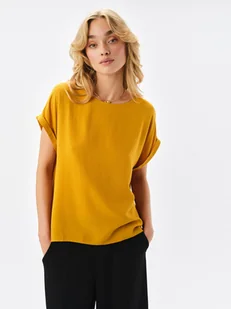 Top damski Top Secret z krótkim rękawem w wersji kimono. Top damski o pełnym luzu oraz swobody fasonie z krótkim rękawem w formie kimono zakończonym ozdobnym podwinięciem. Posiada on efektownie przedłużony oraz zaokrąglony tył, będąc wzbogaconym o okrągły dekolt z delikatną lamówką wokół. Uszyty on został z cechującej się przewiewnością oraz miękkością dzianiny wiskozowej, sprawdzając się doskonale zarówno jako element niecodziennej stylizacji do pracy, jak i też podczas wieczornych wyjść na miasto w gronie przyjaciół. Top damski dostępny w kolorze żółtym TSKJ25BLK000918X00. Modelka ma 176 cm wzrostu i prezentuje rozmiar 34.