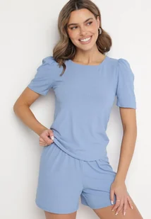 Niebieski Prążkowany T-shirt z Zakładkami przy Rękawach Kolanovia