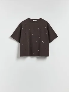 Reserved - Bawełniany t-shirt z aplikacją - ciemnobrązowy