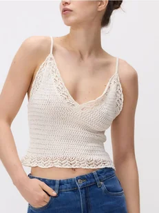 Top o klasycznym kroju, wykonany z dzianiny z dodatkiem bawełny i wiskozy.