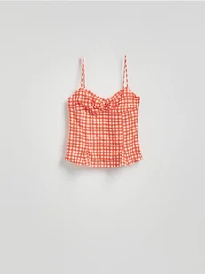 Top o klasycznym kroju, wykonany z takniny z bawełną i lnem.