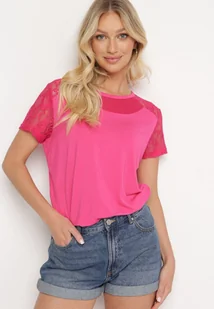Różowa Koszulka T-shirt z Wiskozy z Krótkim Rękawem i Koronką Relliara