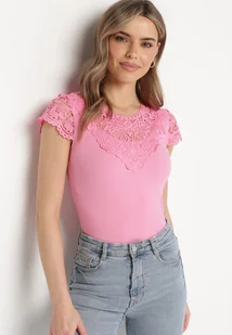 Różowy Prążkowany T-shirt z Koronkową Wstawką Glilama