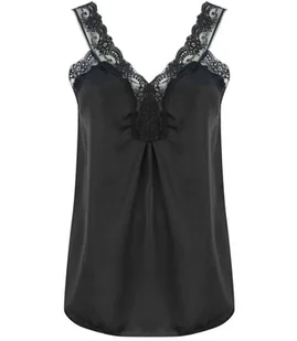 Kobiecy i elegancki top z koronkowym wykończeniem Wykonany z połyskującego materiału Wykończony szeroką koronką w tym samym kolorze Dekolt w serek Luźny krój...