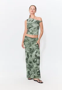 Dopasowana koszulka wykonana z wzorzystej tkaniny tiulowej z wewnętrzną podszewką. Asymetryczny dekolt i rękaw bez rękawów ze szczegółem marszczonej tkaniny.