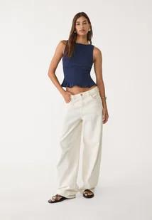 Elastyczny, dopasowany top koszulka z okrągłym dekoltem i bez rękawów. Dół wykończony falbanami. Dostępny w różnych kolorach.