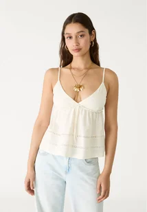 Zwiewny top uszyty z bawełnianej tkaniny. Dekolt w szpic ze sznurkiem i cienkie regulowane ramiączka. Ozdobna wstawka z pasmanterii w dopasowanym kolorze.