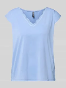T-shirt damski Pieces;Model ‘Kamala Lace’;Efekt: jednolity kolor;Krój: Krój relaxed fit;Aplikacja: Obszycie koronką;Dekolt: Dekolt w serek;Rękaw: krótki;Materiał: Mieszanka modalu