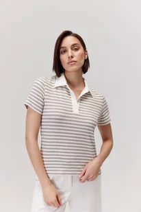 Najważniejsze cechy: Materiał: dzianina prążkowana – elastyczna, dopasowująca się do sylwetki i przyjemna w dotyku; Kolor: paski w odcieniu jasnej szarości i śmietankowej bieli – harmonijne i naturalne zestawienie; Detal: kołnierz wykonany z miękkiej dzianiny; Długość: standardowa – idealna do noszenia wpuszczona lub na zewnątrz.