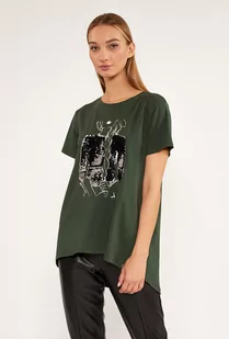 T-shirt z cekinowym panelem, krótkimi rękawami oraz półokrągłym dekoltem. T-shirt z dłuższym tyłem. Model ten idealnie sprawdzi się na co dzień. Modelka na zdjęciu ma 177 cm wzrostu i prezentuje rozmiar 36.