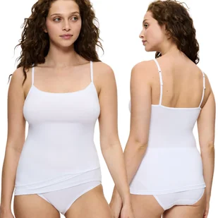 W pigułce: Koszulka damska na cienkich ramiączkach, ramiączka z regulacją, wykonana z delikatnego, miękkiego modalu, podłużny dekolt, klasyczna biel. skład: 87% modal, 13% elastan
