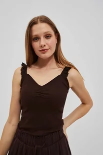 95%BAWEŁNA 5%ELASTAN Top w kolorze brązowym. Gładki materiał, bez wzorów. Cienkie ramiączka z ażurowego materiału z ozdobną falbanką. Głęboki dekolt w serek,...
