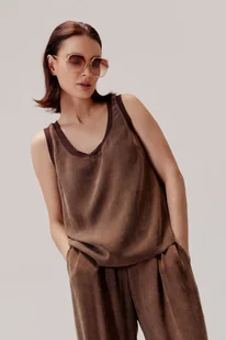Zestaw Figro to połączenie minimalistycznego designu ze sportowym wykończeniem, które sprawdzi się zarówno na co dzień, ale i na wyjątkowe wyjścia. W skład kompletu wchodzą: szerokie spodnie, zwiewna bluzka oraz subtelny top, tworząc harmonijną całość idealną. Najważniejsze cechy topu Figro: delikatność i uniwersalność - może być noszony samodzielnie lub jako element warstwowy pod bluzkę;