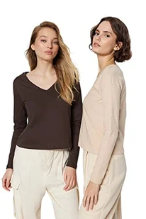 Trendyol Damska damska koszulka podstawowa, standardowa, dekolt w serek, beżowo-brązowa, XS, Beżowy/brązowy, XS