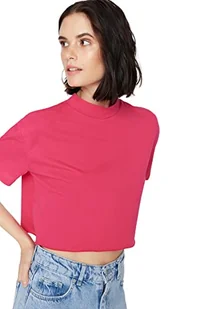 Trendyol Damska koszulka basic z dzianiny o regularnym kroju z kołnierzem stojącym, fuksja, S, fuksja, S