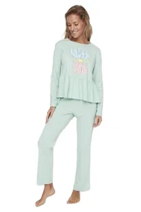 Trendyol Damska koszulka z dzianiny z nadrukiem średniej grubości - spodnie piżamowe zestaw, Miętowy, S