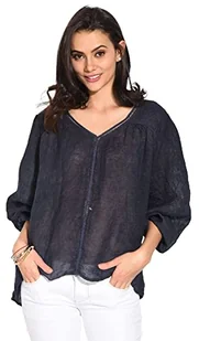 Tunika damska 100% lniana Made in Italy, top z dekoltem w serek i koronkowym karczkiem z długimi rękawami, granatowa, rozmiar: M, granatowy, M