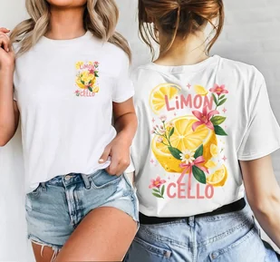 Wakacyjna a koszulka damska w cytryny T-shirt damski o modnym kroju. Rękawki proste. Koszulka z wyjątkową grafiką . Bluzeczka wykonana z bawełny. Koszulka z nadrukiem -materiał : bawełna.