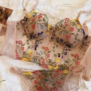 Komplet bielizny gorsetowej w kwiaty - Beżowy S